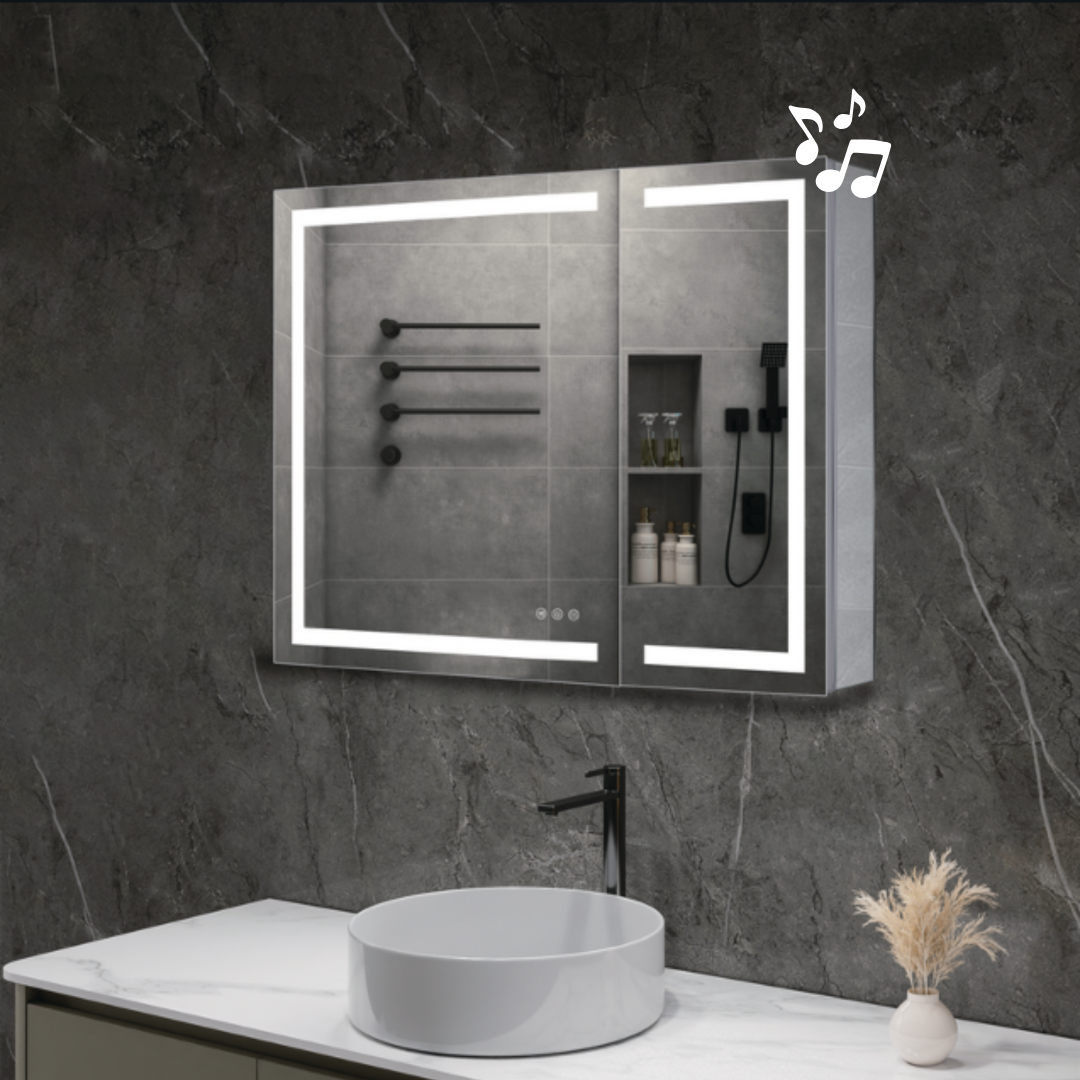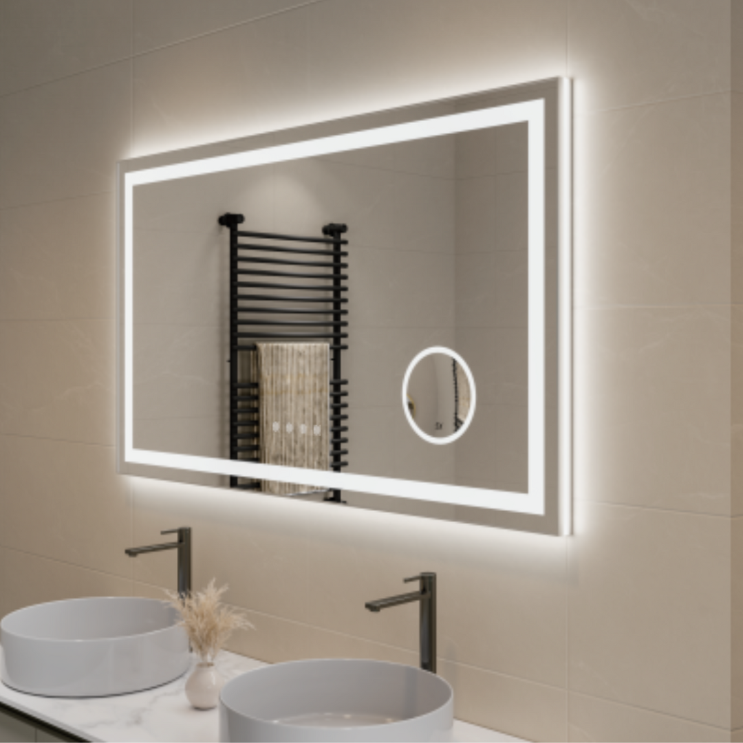 This sleek rectangular LED mirror offers front and backlighting for balanced, customizable illumination. Equipped with an anti-fog function, it ensures a clear reflection even in steamy environments. Adjust the brightness to suit your needs and enjoy built-in Bluetooth for streaming music or taking hands-free calls while you get ready. A small round magnifying mirror on the bottom right provides a handy close-up view. Perfect for any modern bathroom or vanity.